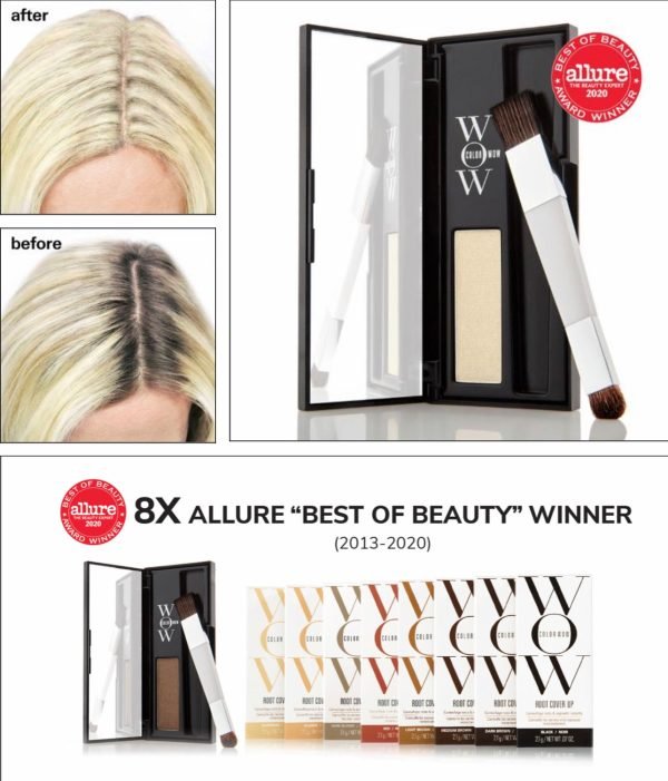 - Root touch up powder covers grey seamlessly, even covers dark roots + extends highlights without peroxide