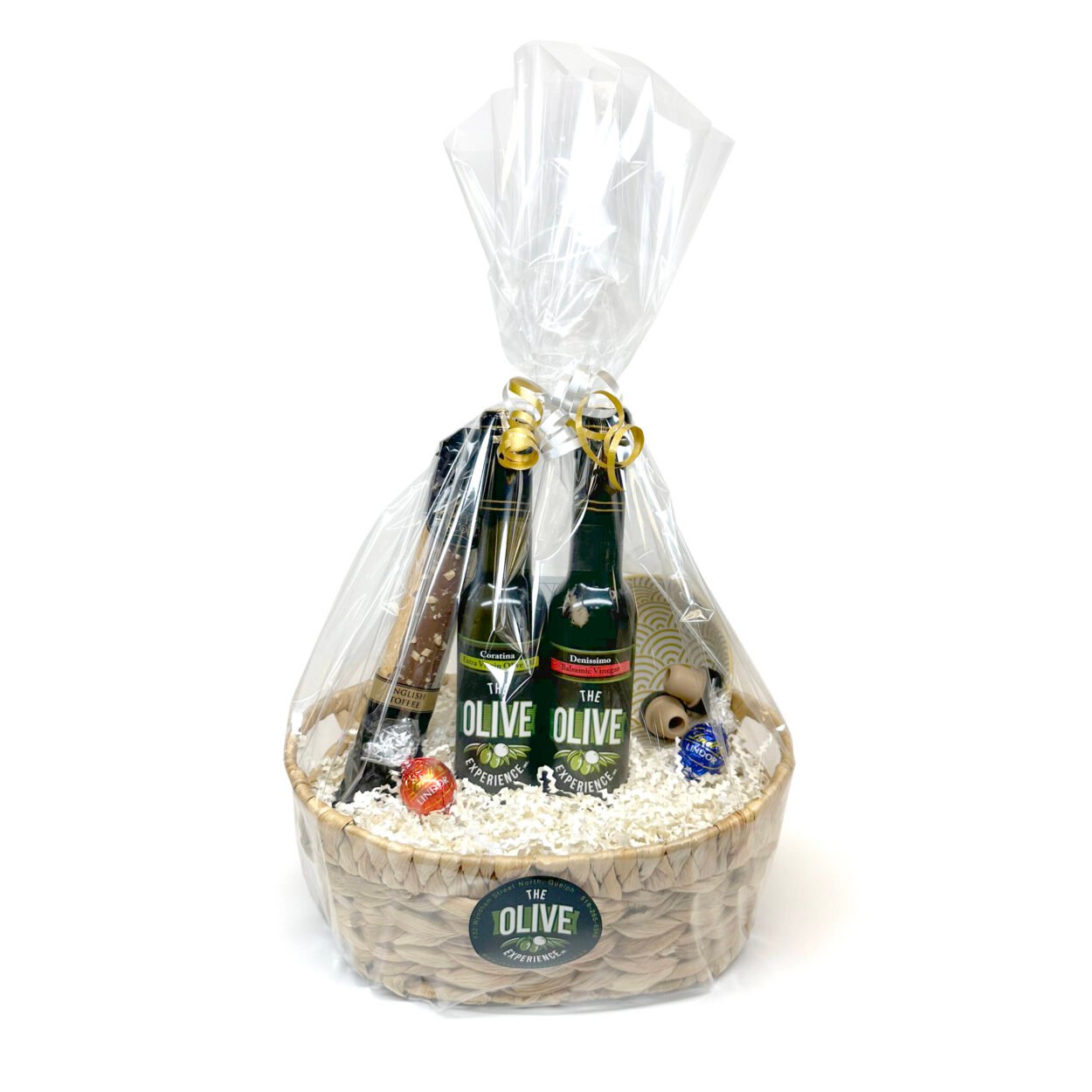 One 200ml bottle of Extra Virgin Olive Oil, one 200ml bottle of aged Balsamic Vinegar, two pour spouts, a small porcelain bowl, a gourmet biscotti, and two chocolates, all in a collectible basket.