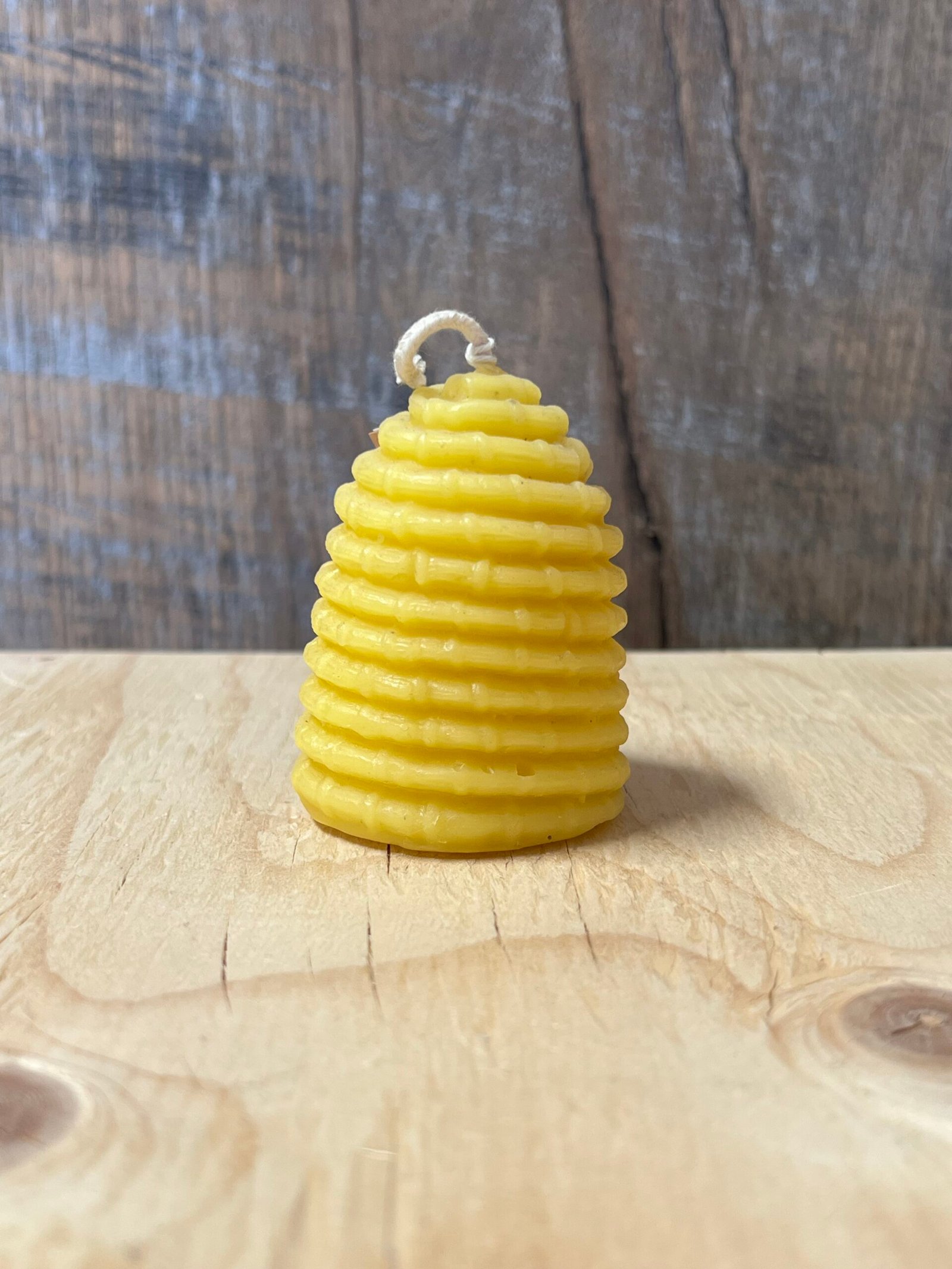 This candle is a handcrafted beehive-shaped candle with a natural golden hue. A charming addition to any space.