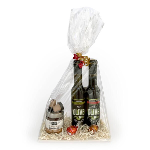 One 200ml bottle of Extra Virgin Olive Oil, one 200ml bottle of aged Balsamic Vinegar, two pour spouts, a bottle of gourmet Compote, and two chocolates, all mounted elegantly on a foam card.